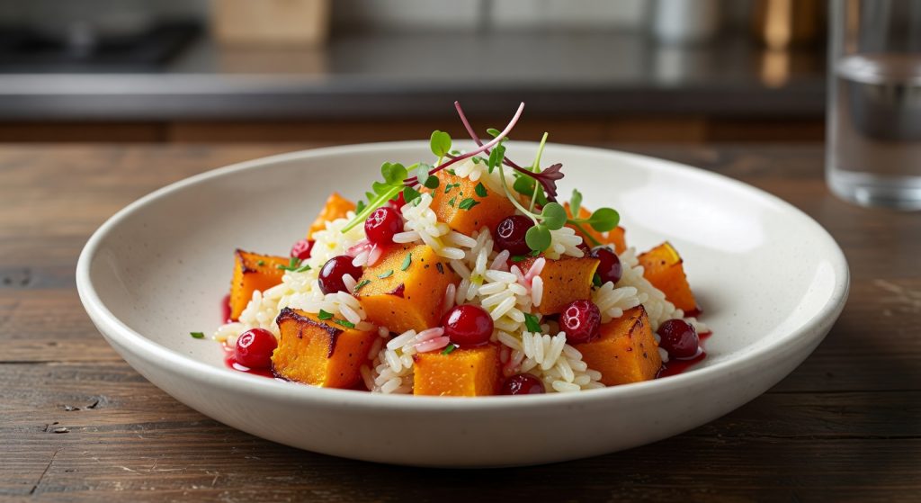 Тёплый салат с тыквой, рисом и клюквой